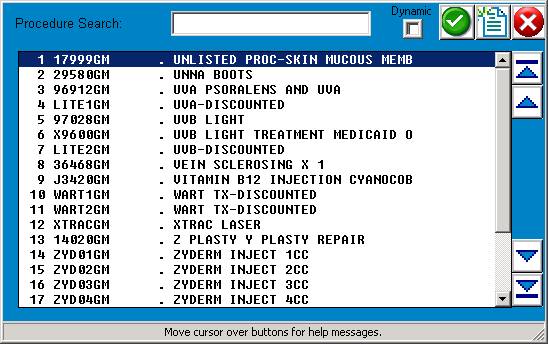 screen listing the procedure codes in the system. The cursor