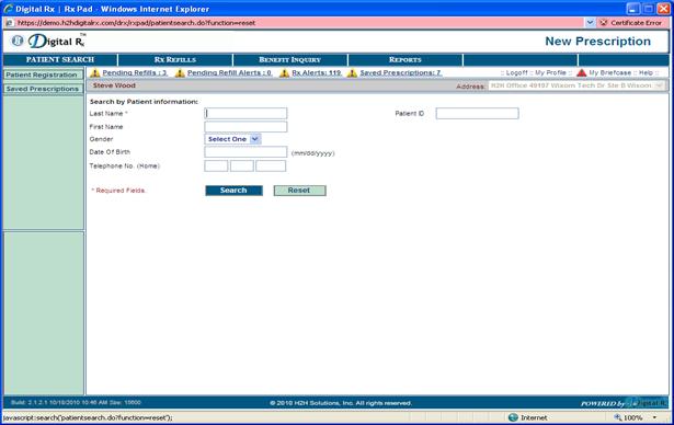 While using Digital Rx it is important to keep in mind that the program is centered on the ability to write a prescription. The basis for writing a prescription is to first identify the recipient of the prescription. Each new prescription starts with the search for a patient in which the prescription will be written for. The search screen allows the Digital Rx user to enter information and 8 click search for a list of potential patients.