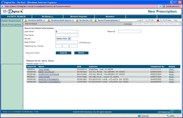 Once the patient information is entered the user can 8 click search. This will result in a list of current patients in the office database sorted by last name. At this point basic demographic information is provided (name, address, and telephone number) however more detailed information is available by 8 clicking the “more” link under the details column. Once the patient name is selected by the user you will be automatically directed to the Rx Pad.