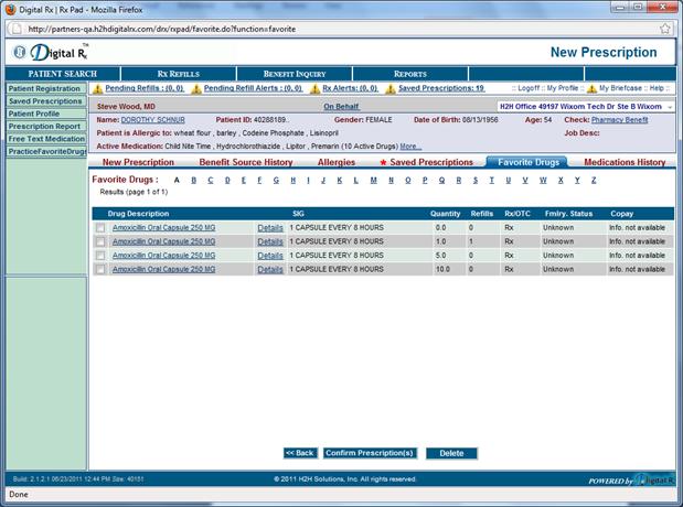 Favorite Drugs provides a list of frequently prescribed drugs by the physician. The user can select a drug from the 8 favorite drug list that provides the drug name and dosage, sig, formulary status and copay by 8 clicking on the medication name or by checking the box next to the prescription and clicking “Confirm”. The medication will be added to the drug name field in the Rx Pad. The user can 8 click on details column and will be provided with the drug name, type, strength, strength unit, dosage form, route, and any instructions listed.