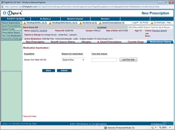 If a patient is no longer taking a medication the user must check the box next to the medication and click the button on the bottom that says “Inactive Drug(s)” in the medication history display screen. This will open a new screen to enter a “Reason for Inactivation” of the medication as shown below and a reason is required to be entered. The will remove the medication from the active list but will always be available on the complete history list.