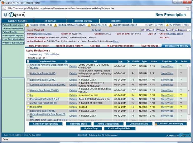 If a drug needs to be reprinted or re-faxed this can be accomplished through the Medications History screen in the bottom menu of tabs as demonstrated in the above screen shot.