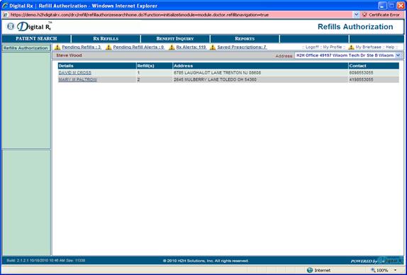 Next to the physicians name is an alert that will notify the user if a patient has requested a refill.