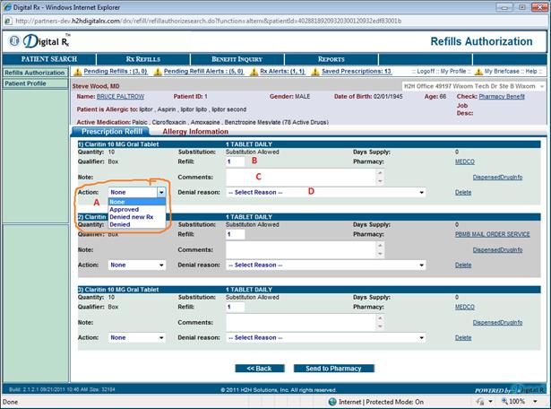 Once having clicked on the patient requesting the refill, all refills for that patient will show up. The user can approve or deny using the drop down “Action field” marked A above. The only fields that can be changed and/or updated are the refill quantity (marked B) and the comments field (marked C). If the refill is being denied, a reason has to be selected from the drop down box (marked D). If “Denied ” with the New Rx selected and “Send to Pharmacy” is clicked on, a denial transaction will be sent to pharmacy and the application will open the Rx pad with the drug details populated so that the new Rx can be sent.
