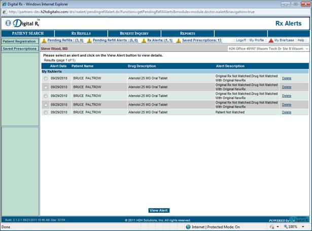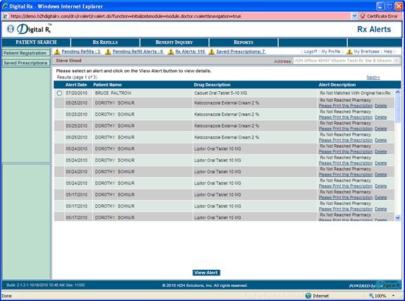 Located at the top of the screen, uses the alert symbol to notify the physician that the pharmacy has questions regarding prescriptions they have received. The user can simply 8 click on Rx alert and will be directed to a listing of patient names including the drug description and alert type.