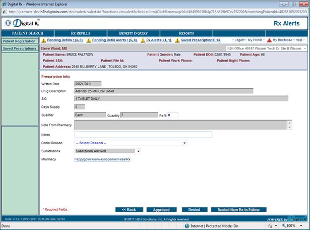 The user can select a patient by 8 clicking the circle next to the name of the patient, or by 8 clicking on the view alert button located at the bottom of the page, and will be directed to the prescription info page. The patient’s personal information, prescription detail, a drop down list of denial reasons, substitutions and pharmacy code and /name are provided on this page. The prescription is authorized by clicking on approved. The user can choose to deny the refill request by 8 clicking on denied, or denied new Rx to follow to alert the pharmacy that a new Rx will be forthcoming. If a printed prescription is desired than the user may select the print at front desk to be taken to an authorized pharmacy for refill. log off is found and the top right side of the 8 prescription list Page. When clicked directs the user back to the 8 log in screen.