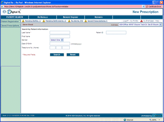 For standalone practitioners, the patient has to be registered manually through the Patient registration page of Digital Rx (Displayed below). Once a new patient is registered you will be directed to the Patient Search screen where you can find the patient that was just registered.