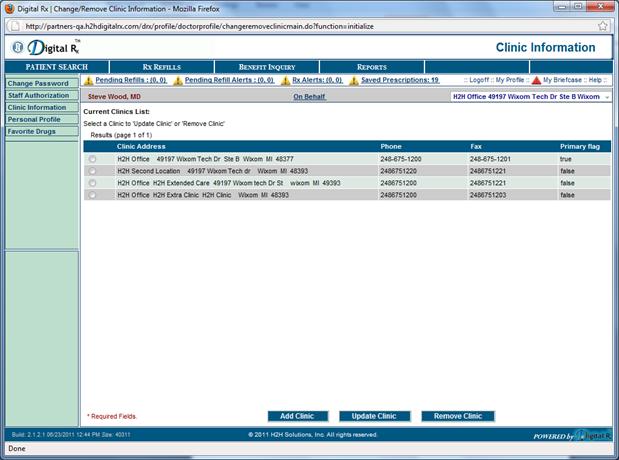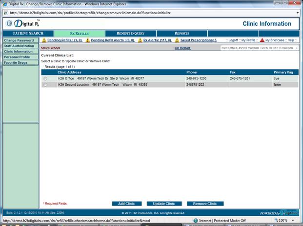 The physician can change password, update clinic information and update their personal information. The below screenshot indicates how to identify the Change Password and Clinic Information via the My Profile page.
