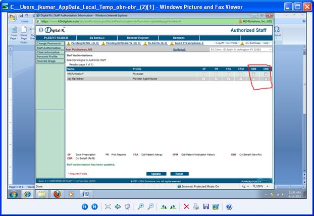 The screen will display all Enrolled users in the practice with check boxes for OBN and OBR. If the User will be sending refills on behalf of ONLY, click on OBR. If the User will be sending New Rx and Refills, click on OBN check box and both will be enabled. Very Important you will be DENIED access to submit Prescriptions ON BEHALF OF if the proper boxes are not selected. Now Select Update option found at the bottom middle section of the page.
