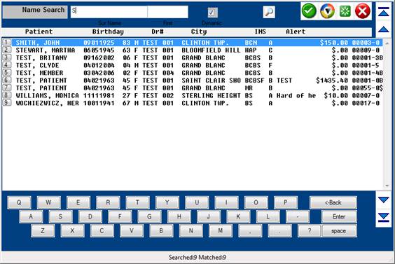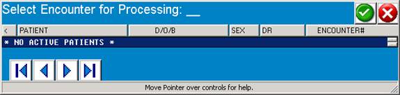 OPEN ENCOUNTER ARROW: Click on the small green drop-down arrow located immediately to the right of the PATIENT search field. This button will show patients whom are waiting for their visit. This list is based on the patient having an appointment scheduled and/or an encounter form generated. Patients can also be added to this list by using the Encounter (E) Command or the Encounter “Button” from the Patient Information Screen.