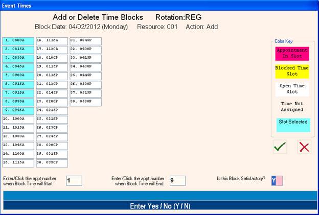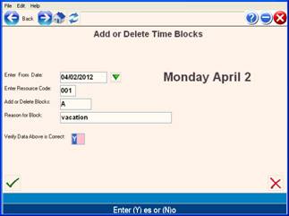 Enter date, doctor # A (add) or D (delete) for the time would like to blocked, verify, click check box √