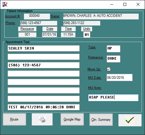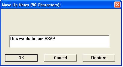 A small Move Up Note screen will come up next allowing you to enter a 50 characters note about this Move Up. This note will appear at the Move Up verification prompt when the appointment is going to be moved up.