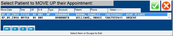 Now all you have to do is wait for a current appointment to cancel or be moved to a new time slot so your appointment can be moved up. When an appointment is Cancelled or Move and Transferred the following Move Up screen (or list) will appear.
