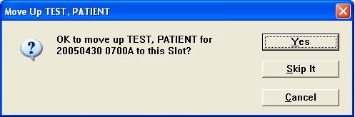 Click the Yes button if it is ok to Move Up this appointment. (Note: Before you do this the patient should be advised so they know about it.) Once you click the Yes button the appointment will be moved to the current time slot and deleted from the Move Up file.