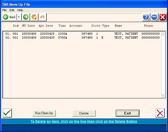 Click the Run Clean Up button to run the Clean Up program. This program will go through the Move Up file and remove any records to be moved up where the appointment date is less than the current date. When the program is done it will return to and refresh this screen.