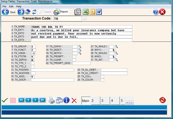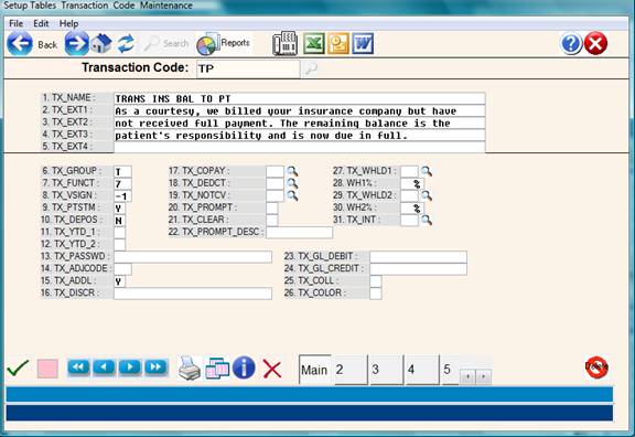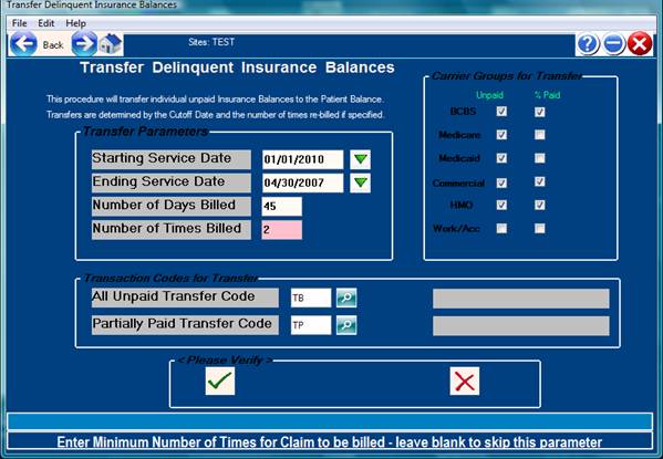 This procedure will transfer all the unpaid insurance balances in the system to the patient based on specific parameters and special transaction codes. Before using this procedure, special transfer codes must be defined in the transaction code dictionary for “TB” ( Transfer to Patient - unpaid ) and “TP” (Transfer to Patient – partially paid ) – see transaction descriptions below. Note: These are suggested codes – any transfer code ( function 7) or description can be used.